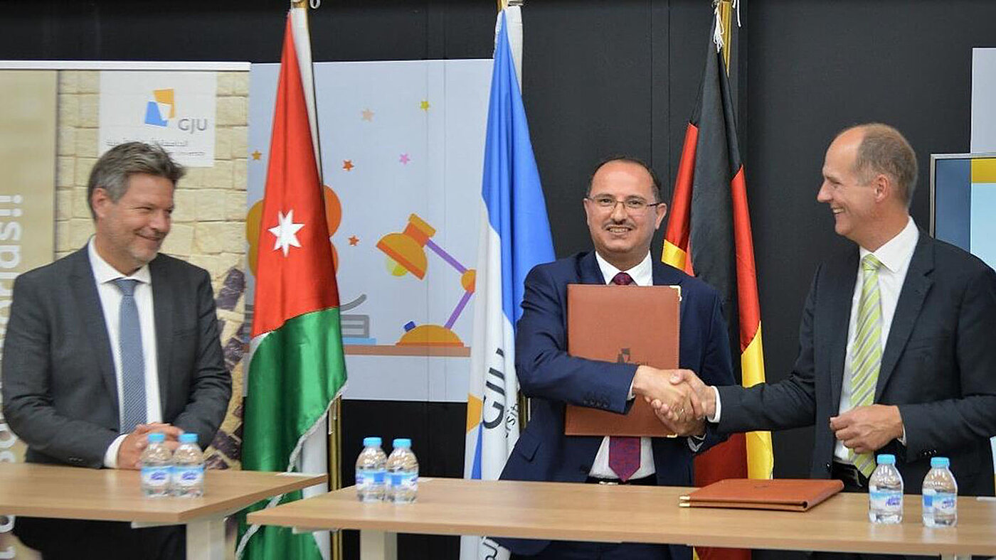 In the presence of Vice Chancellor and Federal Minister for Economic Affairs and Climate Protection Robert Habeck, the President of the University of Applied Sciences (FHWS), Prof. Dr Robert Grebner, and the President of the German Jordan University (GJU), Prof. Dr Alaaldeen Al-Halhouli, signed an agreement in Amman on 8 June 2022 to build a unique bridge between the sun-rich country of Jordan and Germany for prospective hydrogen technicians, who are indispensable for a green energy transition.